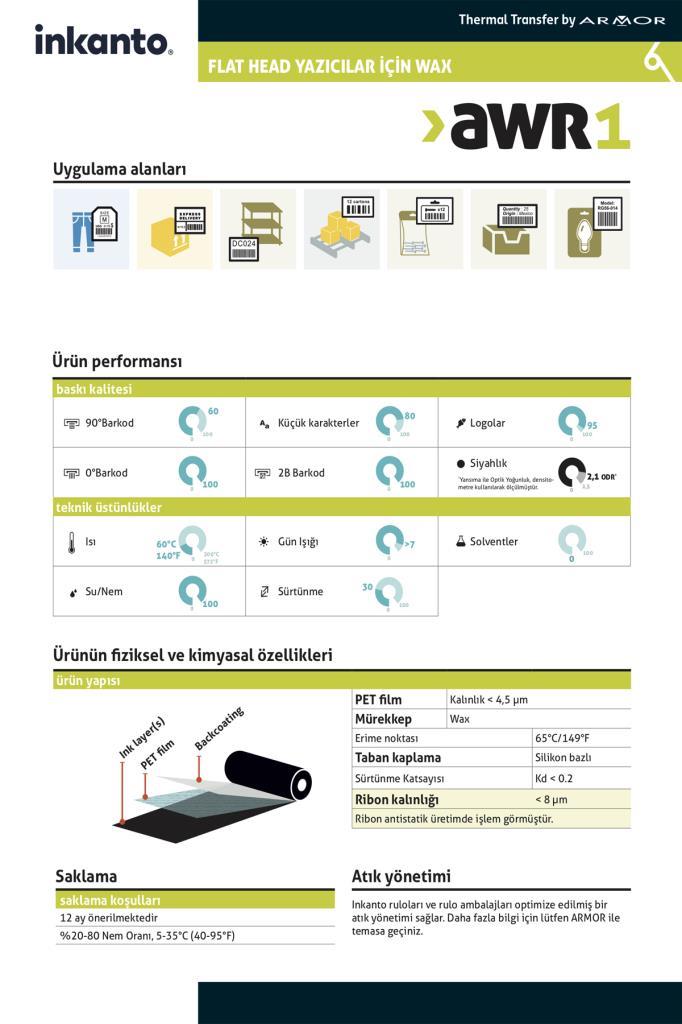 AWR 1, standart etiketleme uygulamaları için uygundur. Çoğu boş ve önceden basılmış etiketle uyumludur. Mürekkebi aktarmak için gereken düşük enerji, baskı kafasının korunmasına yardımcı olur.
